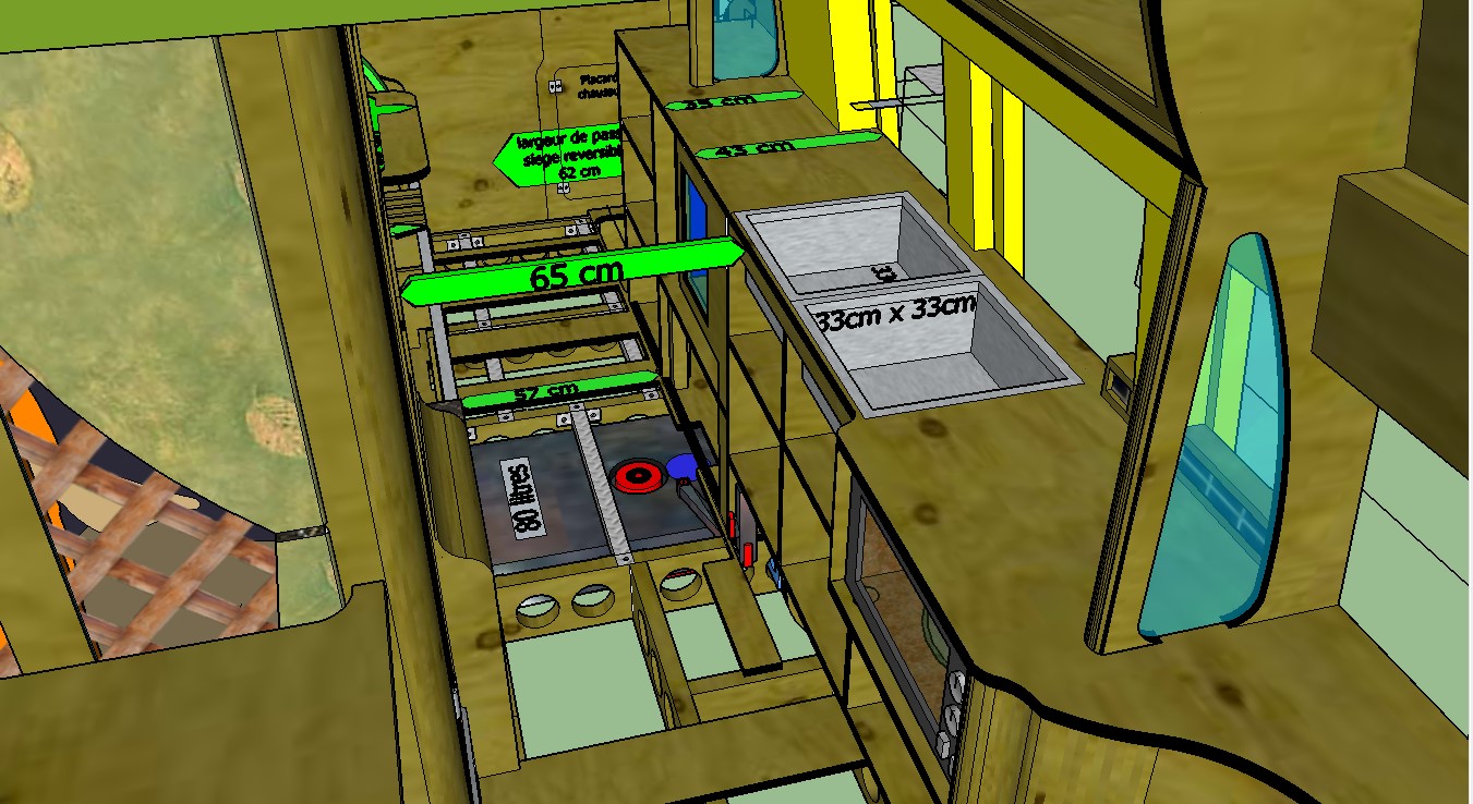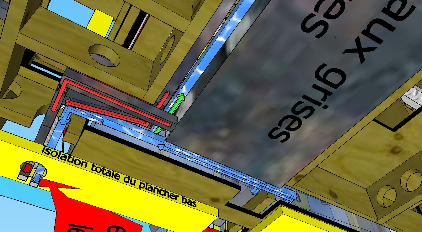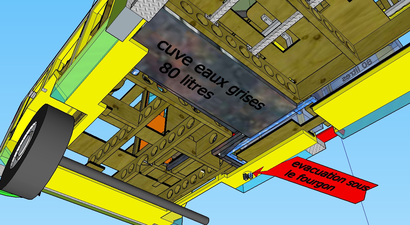 le dessin étant une vue “Éclatée”donc des coupes ,les zones de couleur jaune représentent l’isolation totale du plancher en 45mm sans aucun tasseaux ,visible et expliquée en cliquant sur ce post ( https://vanlife-france.com/forum/Sujet/une-tres-bonne-isolation-du-sol-en-45-mm-sans-aucun-tasseau/ )-les flèches rouges correspondent au sens d’évacuation des eaux “usées”en sortie directe ou depuis la cuve d’eau grise