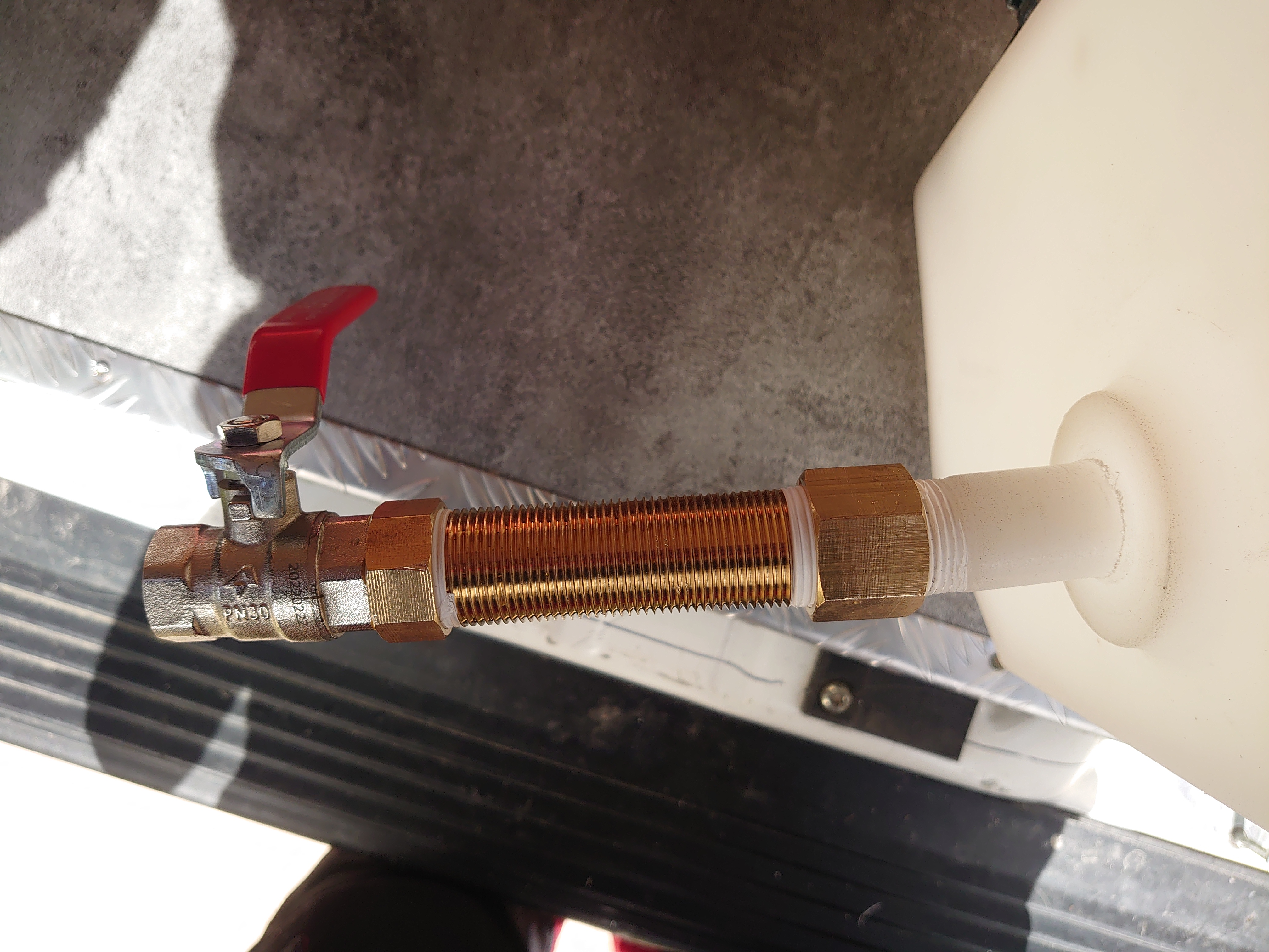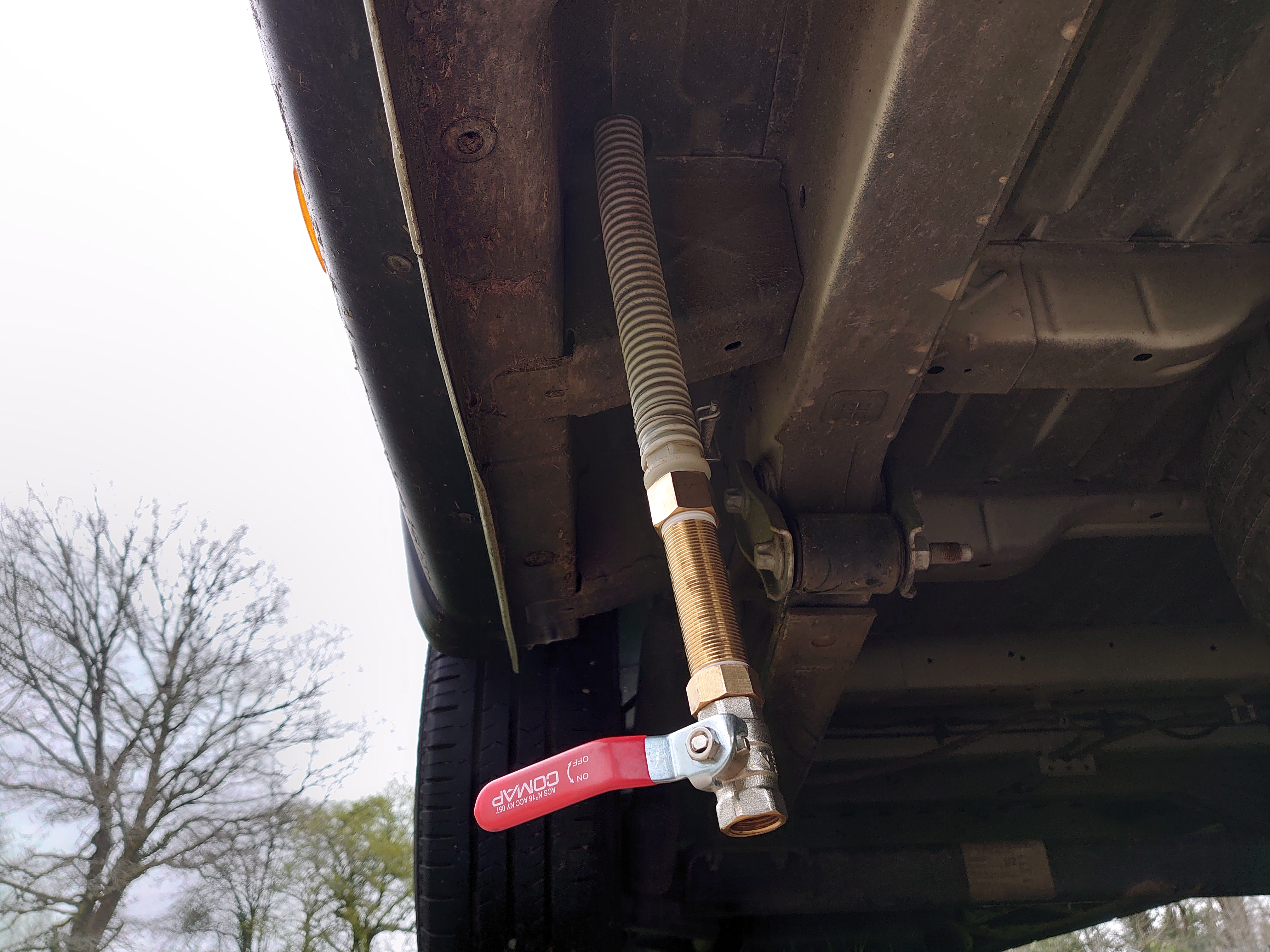 Du coup, j’ai mis un morceau de tuyau armé diamètre 25 et là, nickel, pas de fuite. Il ne me reste qu’a rajouter une fixation sur le châssis pour éviter que la vanne pende sous le camion ( cf photo).