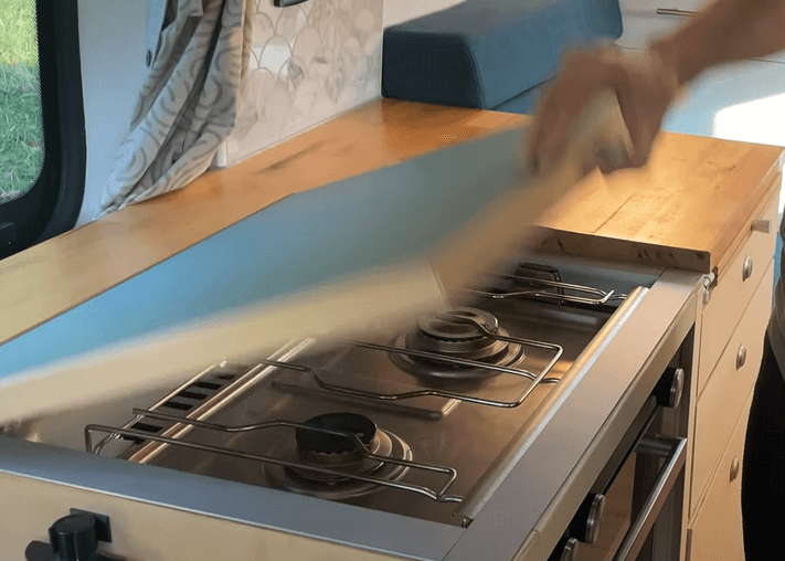 petit lutinModérateursi la tranche de ton plan de travail qui est en bois est exposée à la proximité d’une flamme ,tel que sur la photo,tu peux pratiquement être certain que le mec (contrôleur/certificateur )va troncher ,soit tu décales fortement ce décroché soit tu fais en sorte qu’il soit protégé ,non seulement sur sa tranche mais egalement sur la surface plane (pour créer une zone de sécurité ) jouxtant cette tranche pour être certain de pas te faire refouler