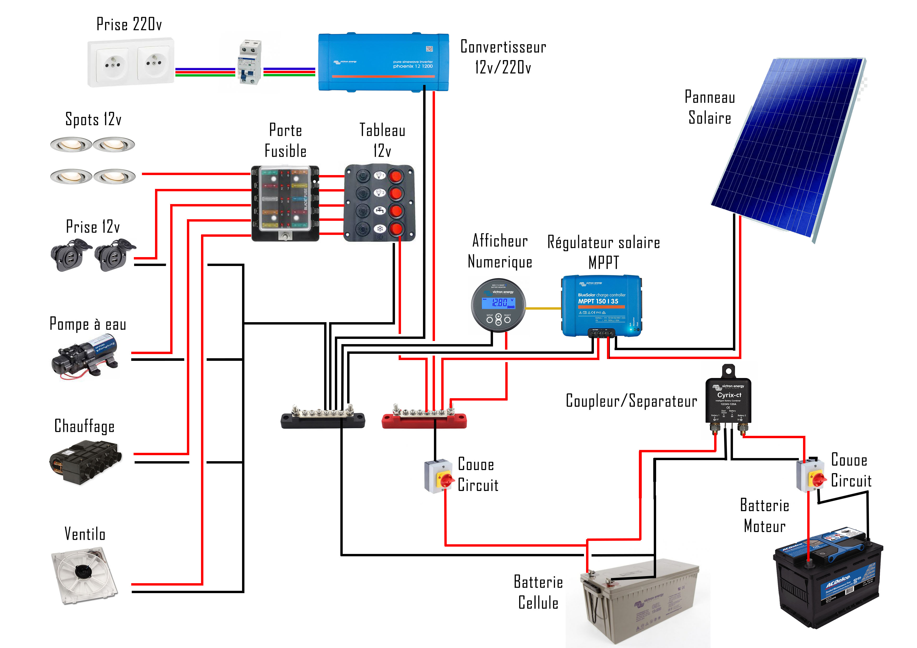 Jolie installation, tu pourrais nous partager ton schéma électrique, parceque j’ai l’intention d’installer exactement le système électrique. Merci