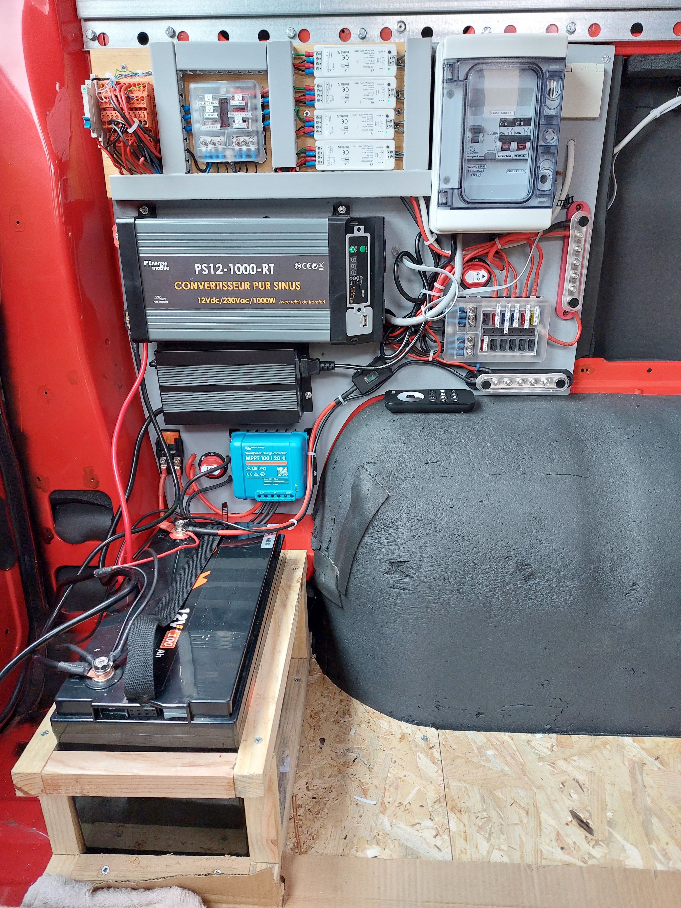 Comme promis voici une photo de mon installation électrique avec notamment la partie éclairage. Le tout est alimenté par un panneau Victron de 305 Watts, une alimentation 220 V avec son chargeur et pour le véhicule je devais monter un Cyrix de chez Victron pour lequel je t’avais demandé conseil mais j’ai préféré commandé un Smart Orion de chez Victron pour plus d’efficacitè. Pour compléter cette installation j’ai également un convertisseur 12V/220V car je veux le minimum de gaz dans le véhicule, uniquement pour la plaque de cuisson.