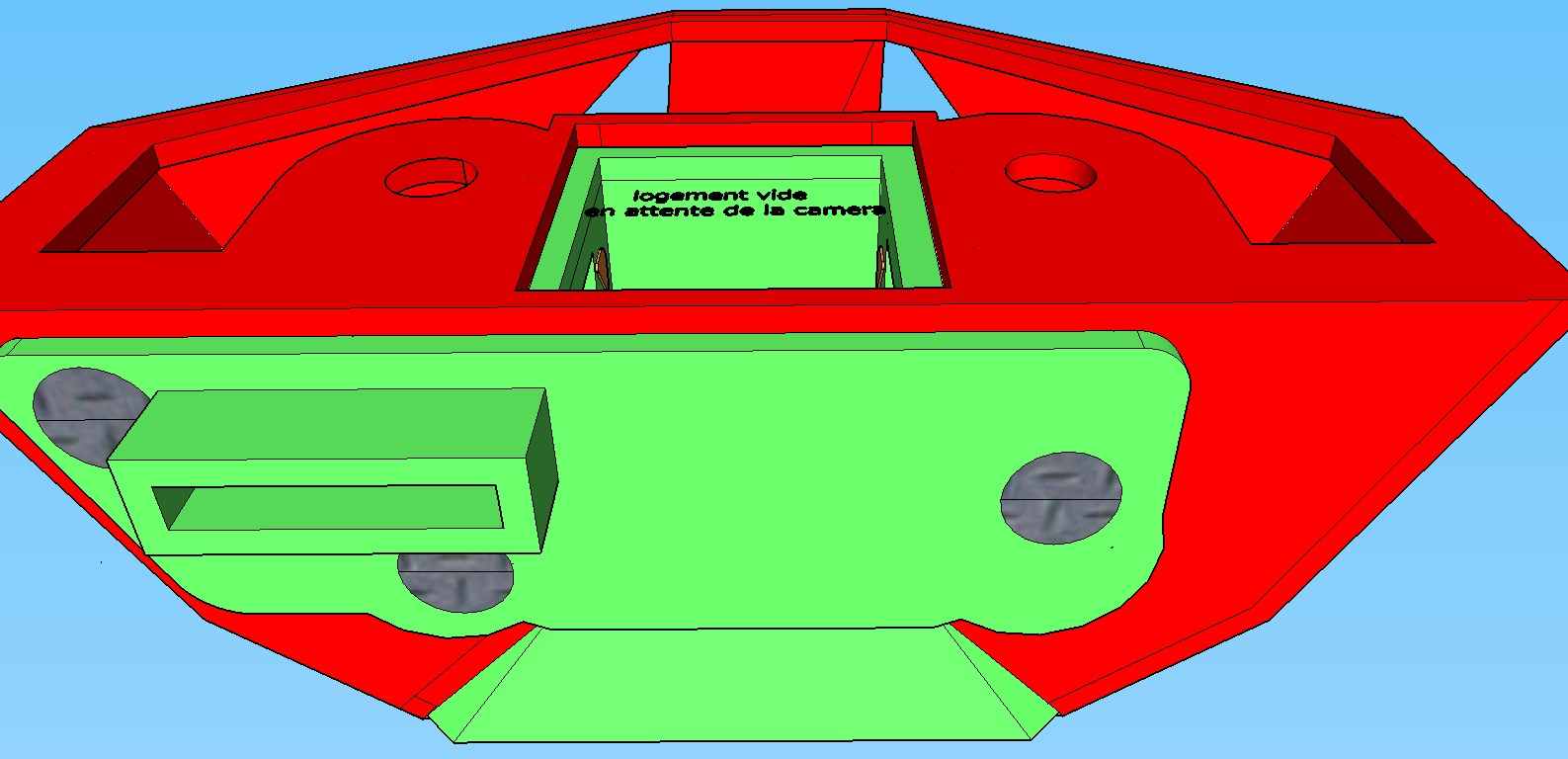 le boitier rouge qui est la protection exterieur,le boitier vert (qui lui est comme une chaussette)venant se glissé dans le boitier rouge, comprenant egalement le couvercle et les 3 vis qui le maintienne au boitier rouge par en dessous .le boitier rouge est fixé contre la carrosserie .le boitier vert contient en 1 seule piece (englobe) la camera + le servomoteur qui sont pourtant chacun dans leur compartiment,le servomoteur sert à ouvrir/fermer le volet de protection de l’optique (donc en face avant)