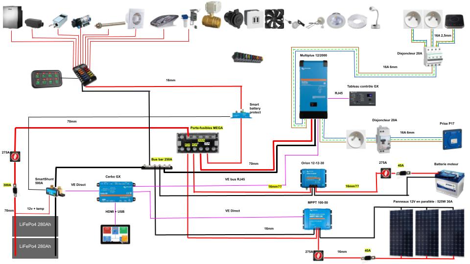J’ai survolé un peu ton schéma, je mettrais un fusible de 40A à la place du 220A entre la batterie porteur et le Orion, j’enlèverais le coupe circuit qui ce trouve sur cette ligne, et un câble de 25mm2 suffirait, bien que je ne connais pas la longueur mais si c’est pour un fourgon ça devrait être suffisant.